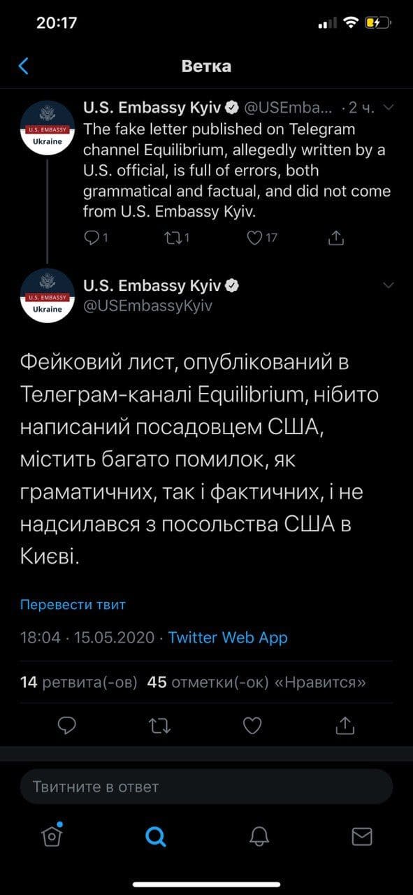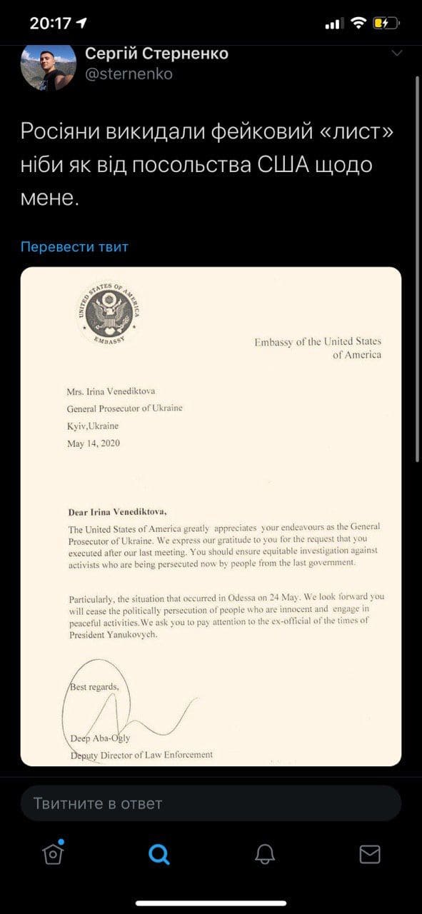 І все було б нічого, ми тоді всі просто посміялись з того, наскільки російська агентура не здатна у фактчекінг та мінімальний рівень знання граматики англійської мови, тим самим показавши свою нікчемність, але ситуація змінилась на наступний день, коли її прокоментувало Посольство США і особисто С.Стерненко.